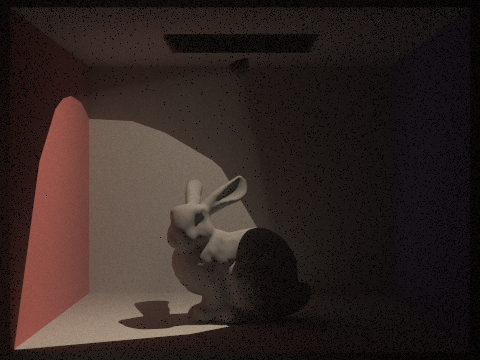 If this light gets scattered, we will use inverse CDF sampling on the phase function to determine which way the light is reflected. This phase function is essentially a mathematical model for how particles tend to scatter light in the real world. Some materials tend to let light through more, which means that the light is more likely to continue going forwards, while some act the opposite way. We implemented the Henyey-Greenstein and Isotropic phase functions. However, much like our hemisphere sample method in homework 3, this method might be physically correct but does not converge nearly as fast as we would like. Thus, we created an importance sampling method, where we intentionally sample towards light sources, and unbias those samples by weighing these samples with the probability of the phase function sampling in this direction.